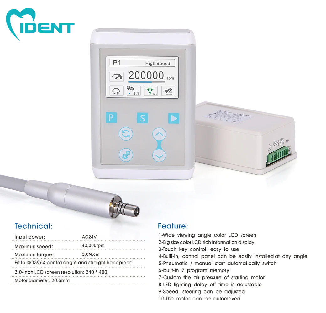 According to the different treatments and different handpieces , the speed can be adjusted from 100-200.000rpm/min