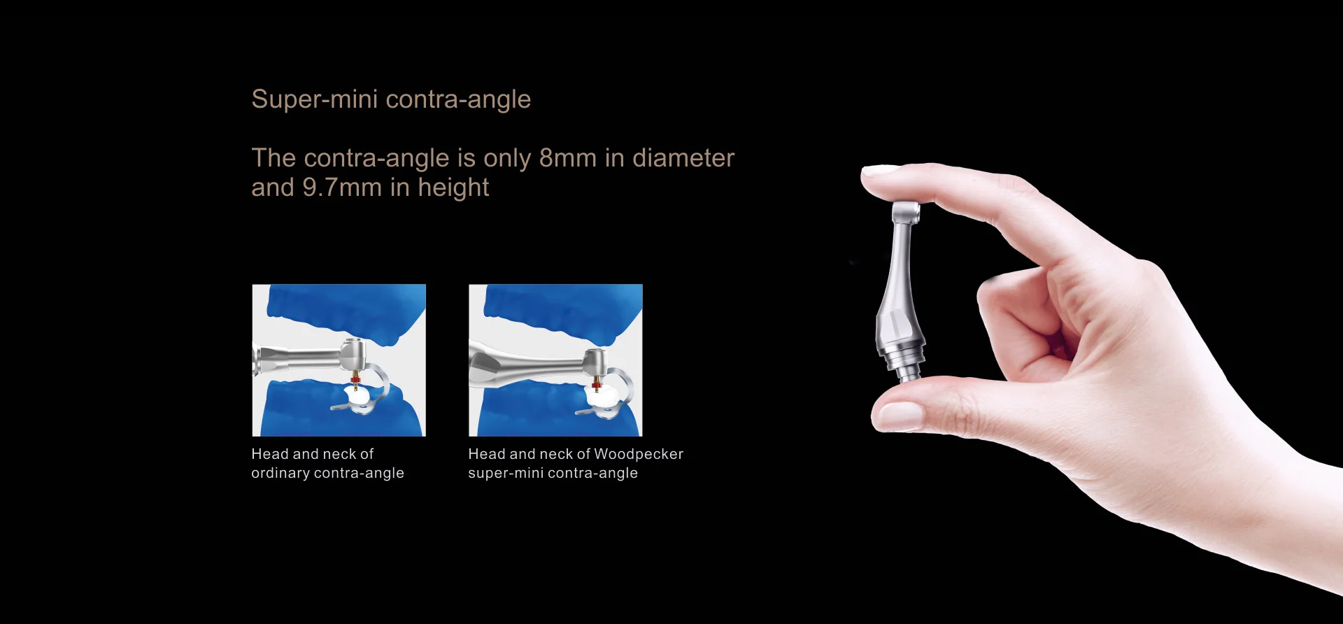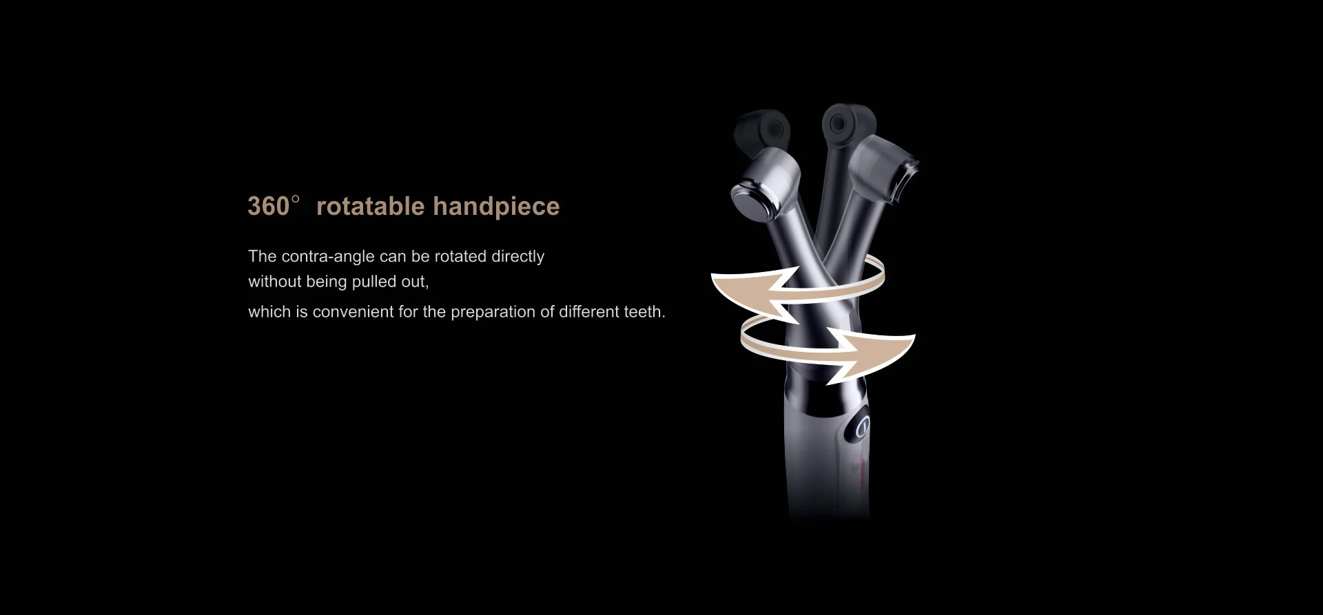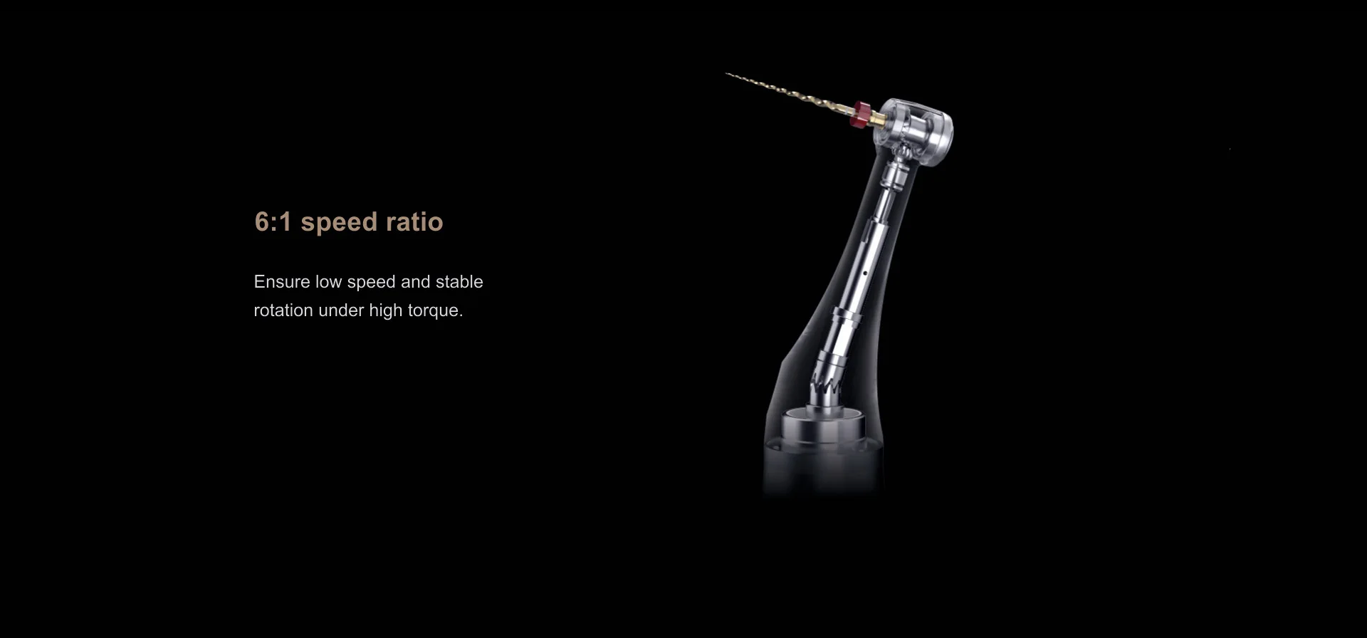– 360° Rotatable Contra-angle, 6:1 Super Mini Curved Handpiece. Smooth rotation, lower noise, and small vibration in handpiece doctors feel good during operations. Patients will have a new experience in root canal therapy.