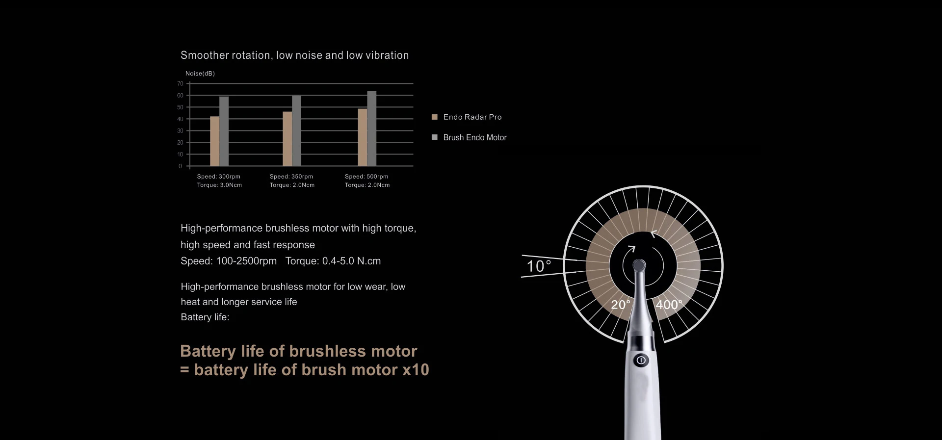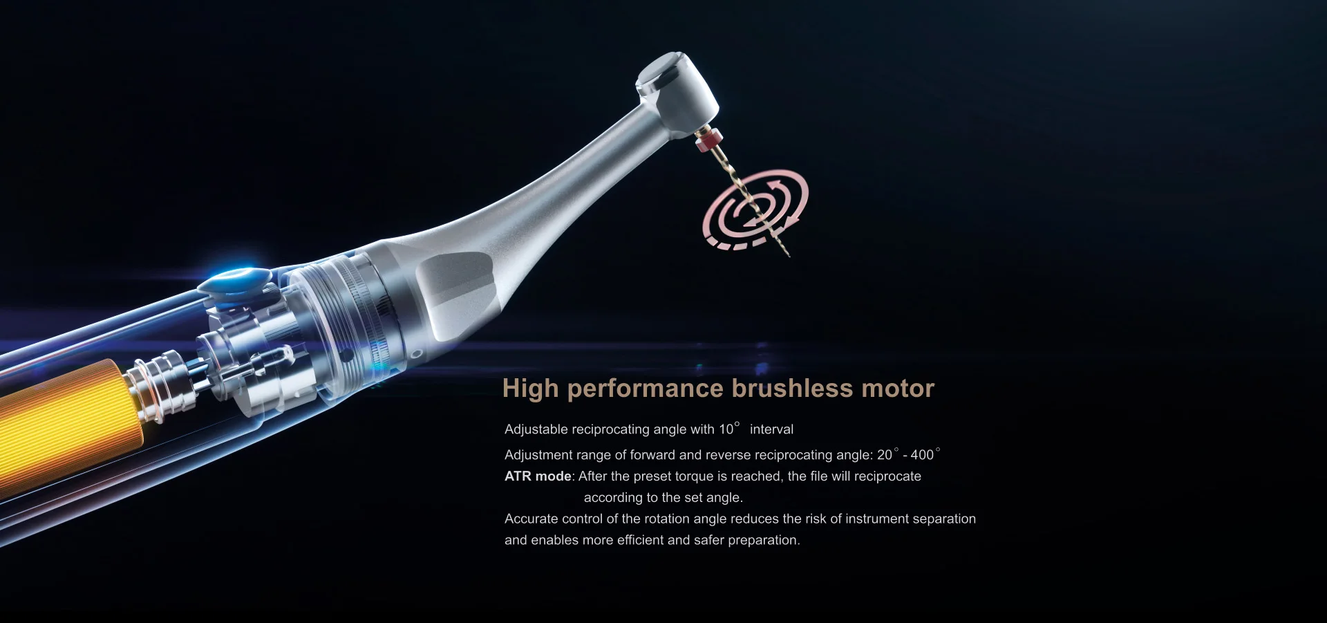 – High-performance Brushless Endo Motor. Super high torque, high speed, lower noise, fast response, more accurate output, and more stable, ensuring more efficient & safe preparation.