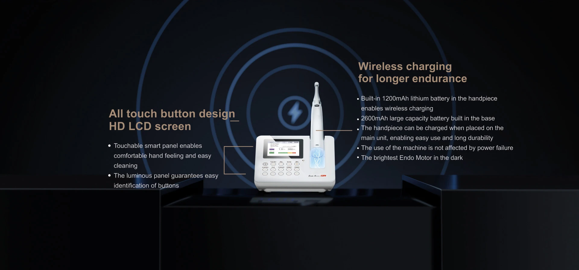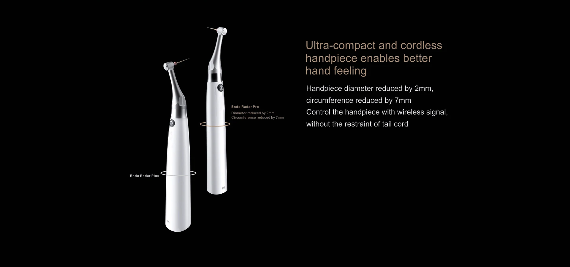 – Wireless Connection. Use a wireless signal to control the handpiece, realizing flexible operation without the restraint of the tail cord.