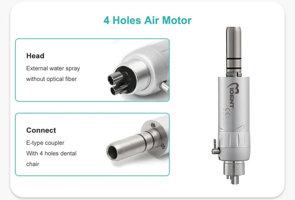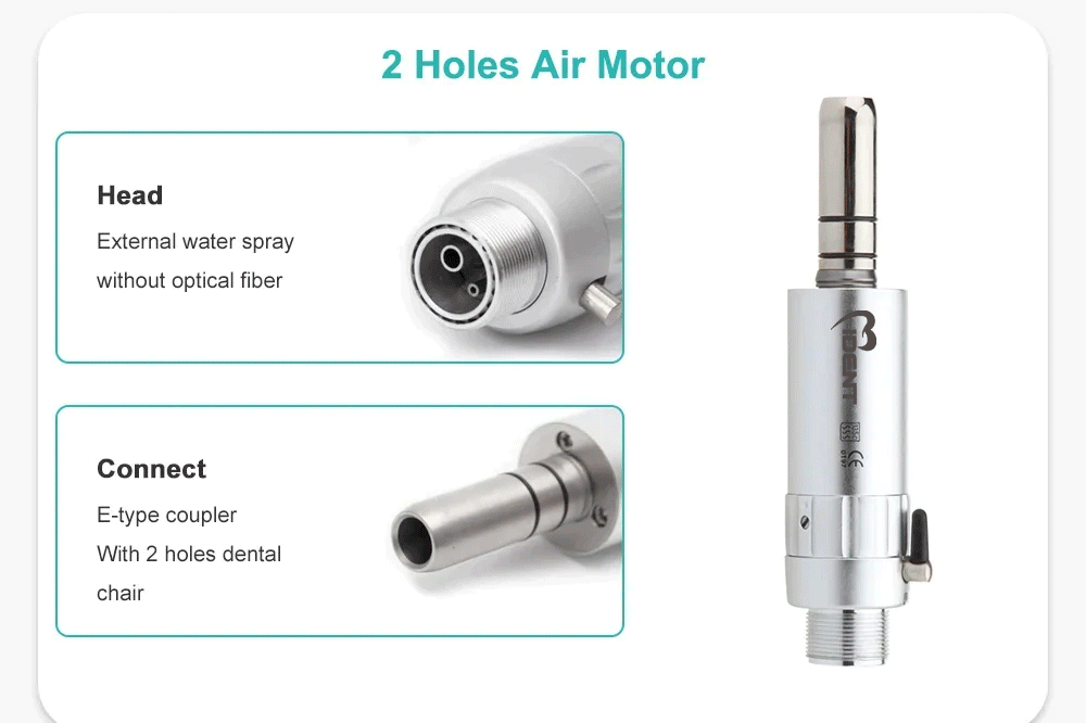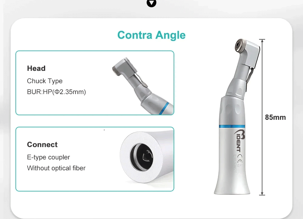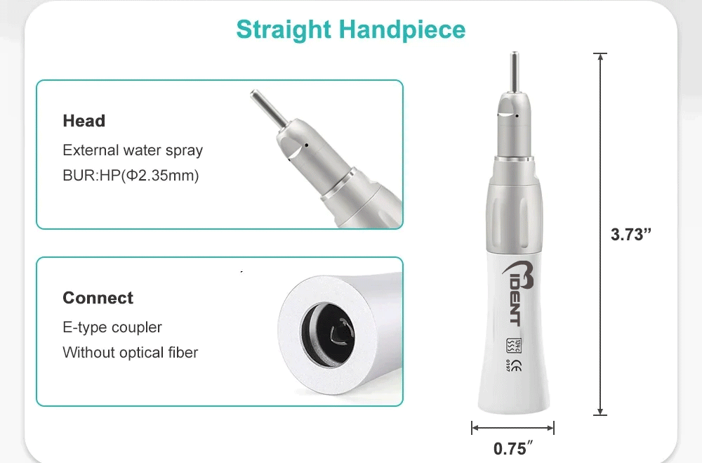 Type: Dental Handpiece Max speed: 40,000 min/rpm Connector:Dental chair Gear Ratio:1 :1 Direct Drive Bur Type:For CA burs ( ф2.35) Bur Length:11.6-22.5mm Water Spray:External Water Spray Optic:Without Glass Rod Connector:2 hole/4 hole