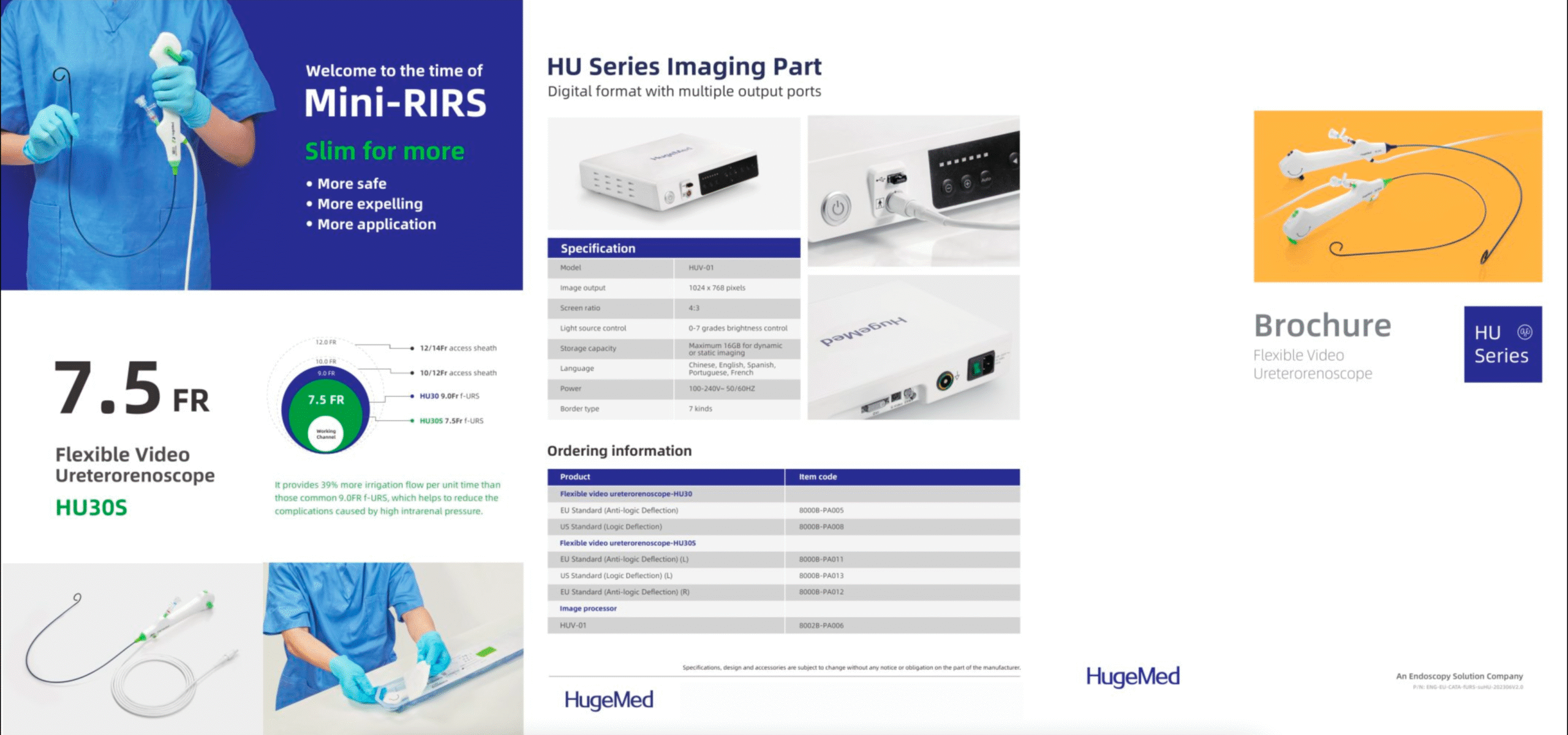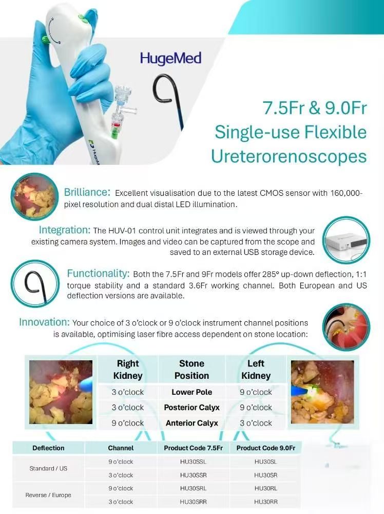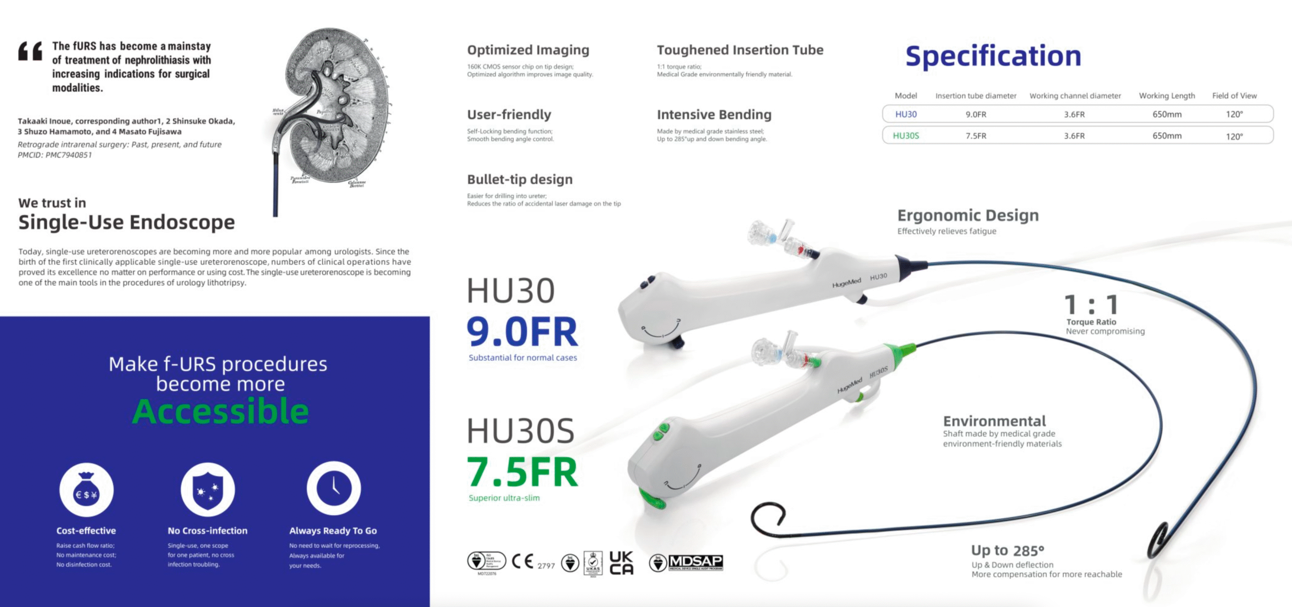 Urologic endoscopes Hugemed HU30 Video ureteroscope 7.5Fr /9.0 Flexible Ureteroscope 7.5 Fr Urology Video Disposable Ureteroscope