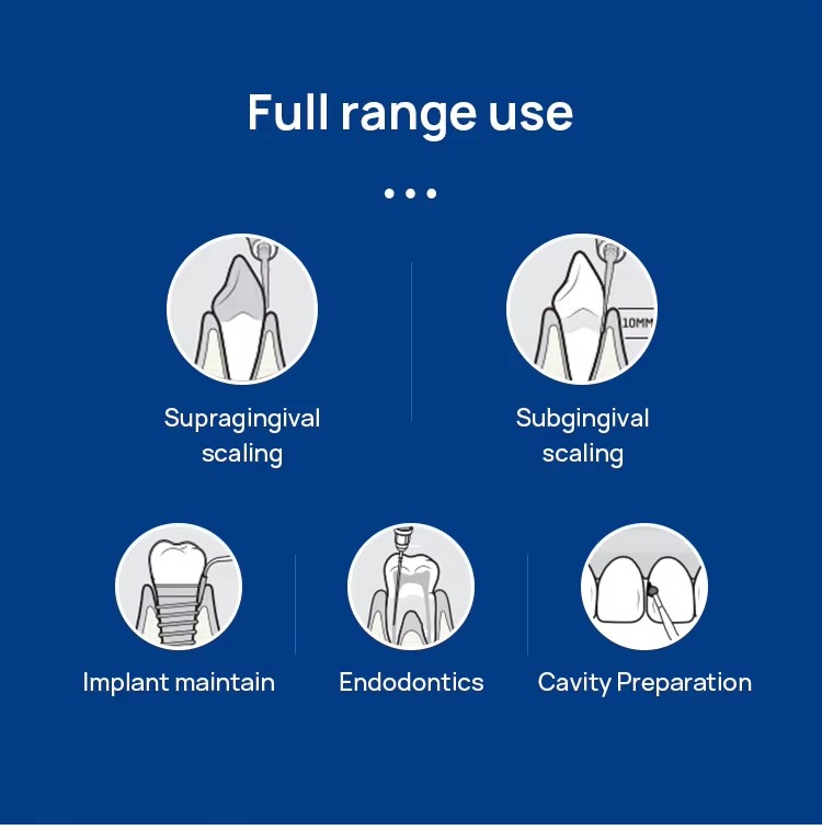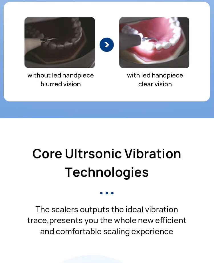 2.With more than 10 years of research on piezoelectric ceramic ultrasonic vibration technology, The new scalers outputs the ideal vibration trace, presents you the whole new efficient and comfortable scaling experience.