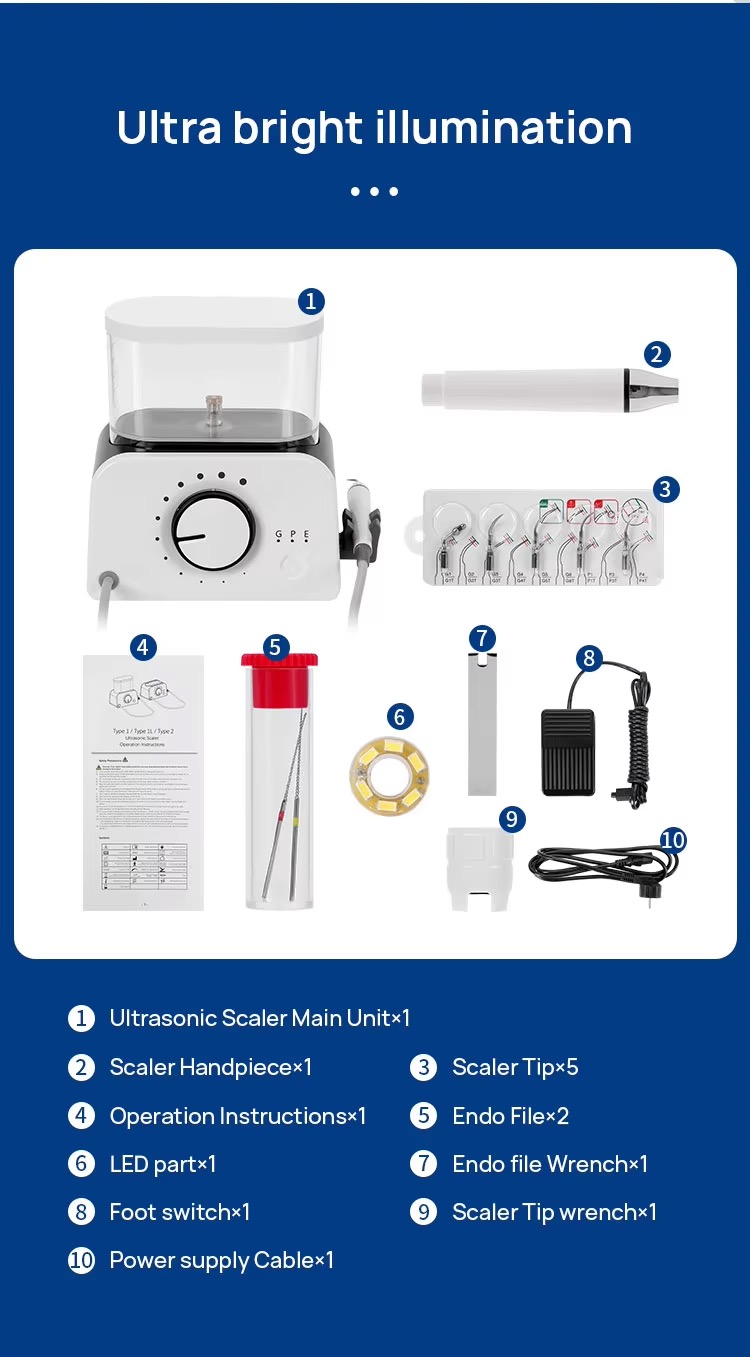 1.From prophylaxis and periodontology to implant maintenance or endodontics right up to the micro-preparation of restorations, the whole new piezo scaler offers you a variety of efficient solutions.